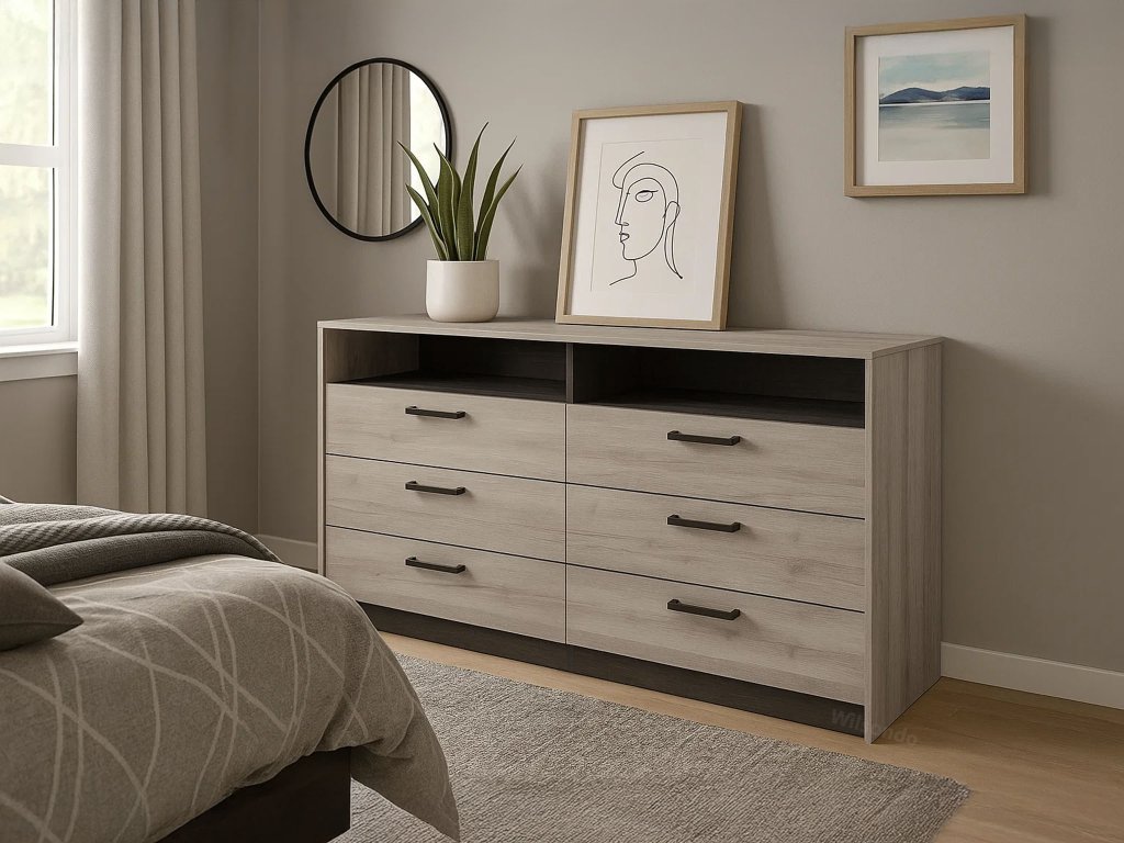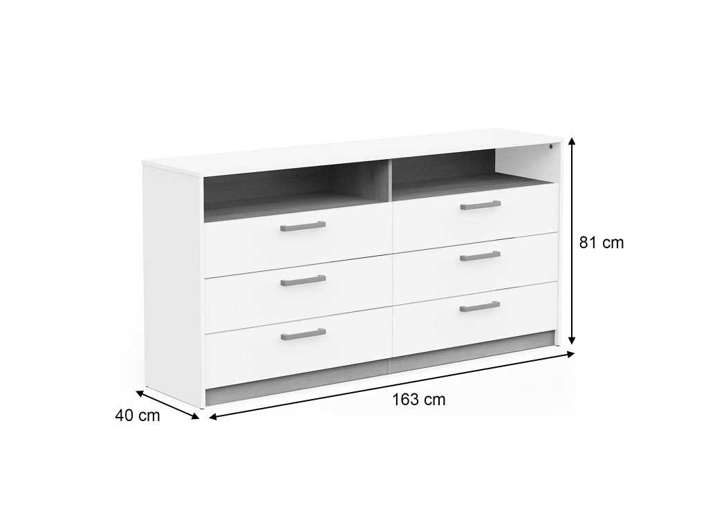 Hat tágas fiókja van ruhák, iratok vagy egyéb személyes tárgyak tárolására, valamint egy nyitott polc, amely ideális dekorációk, könyvek vagy mindennapi használati tárgyak elhelyezésére.