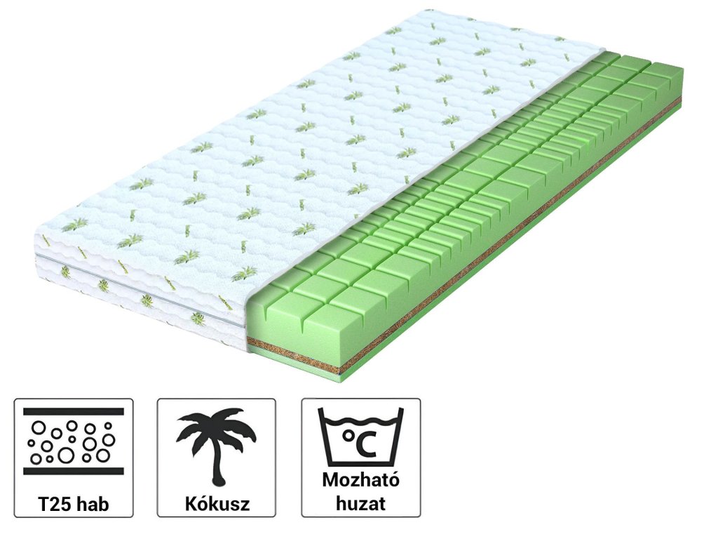Anyagösszetétel: profilozott T25-ös poliuretán hab, kókuszdeszka, steppelt Aloe Vera huzat