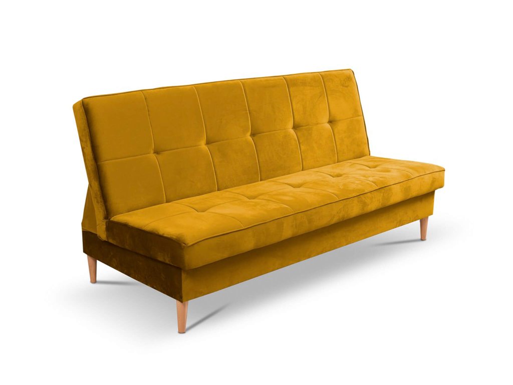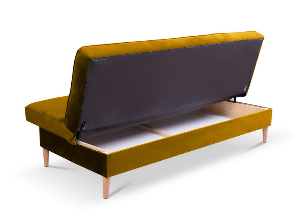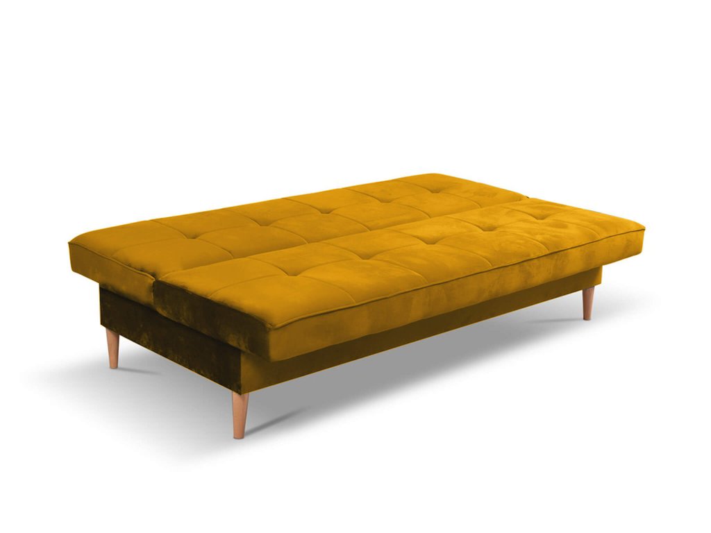 Különleges és egyedülálló gyönyörű mustársárga WERSA kinyitható kanapéágy tároló hellyel, amely tökéletes lehet a nappaliba. Viszont megtalálja a helyét a konyhában vagy az étkezőben is. Szétnyithatja a kanapét és egy kényelmes fekhelyet hozhat létre. Ide lefekhet egy kicsit pihenni a finom ebéd után. Az ülőrész felnyitásával hozzáfér a praktikus tároló helyhez. A kanapé időtálló designnal készül, gyönyörű steppelés és gombok díszítik. A kihúzható kanapé ellenálló és kellemes bársonyos sárga velúr szövettel kárpitozott. A kanapé tömör fa lábakkal rendelkezik natúr színben.