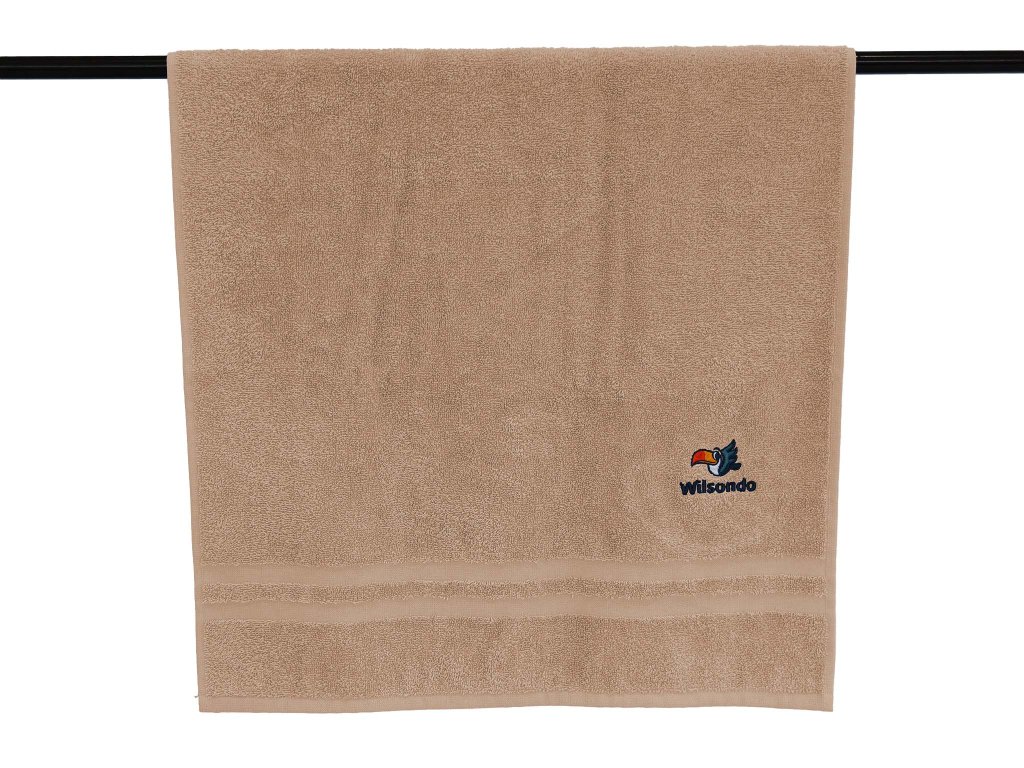 A Wilsondo bézs színű törölköző, 50×100 cm-es méretben, kiváló választás mindennapi használatra otthon, az edzőteremben vagy utazáskor is. 100% frottír pamutból készült, 400 g/m² anyagsűrűséggel, így remekül felszívja a vizet és kellemes tapintású. A megerősített dupla hurkolás nagyobb tartósságot biztosít még többszöri mosás után is.