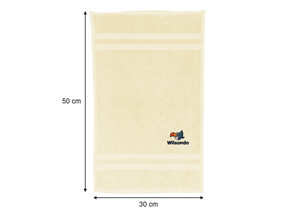 A krémszínű Wilsondo törölköző 50×30 cm-es méretben kiváló választás kéz-, arc- vagy utazótörölközőnek. 100% frottír pamutból készült, 400 g/m² súlyban, így minden használatkor kiváló nedvszívó képességet és puhaságot biztosít. Az erősen varrott szegély és a megerősített dupla akasztó hosszabb élettartamot garantál még gyakori mosás mellett is. Az elegáns logó tiszta megjelenést kölcsönöz a törölközőnek, így bármely fürdőszobába vagy bőröndbe tökéletesen illik.
