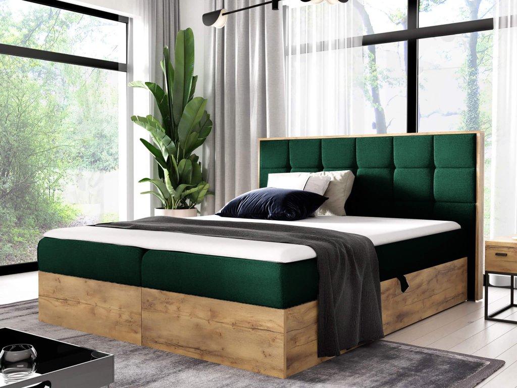 WOOD 1 ágyneműtartós kárpitozott boxspring ágy matraccal - zöld Kronos