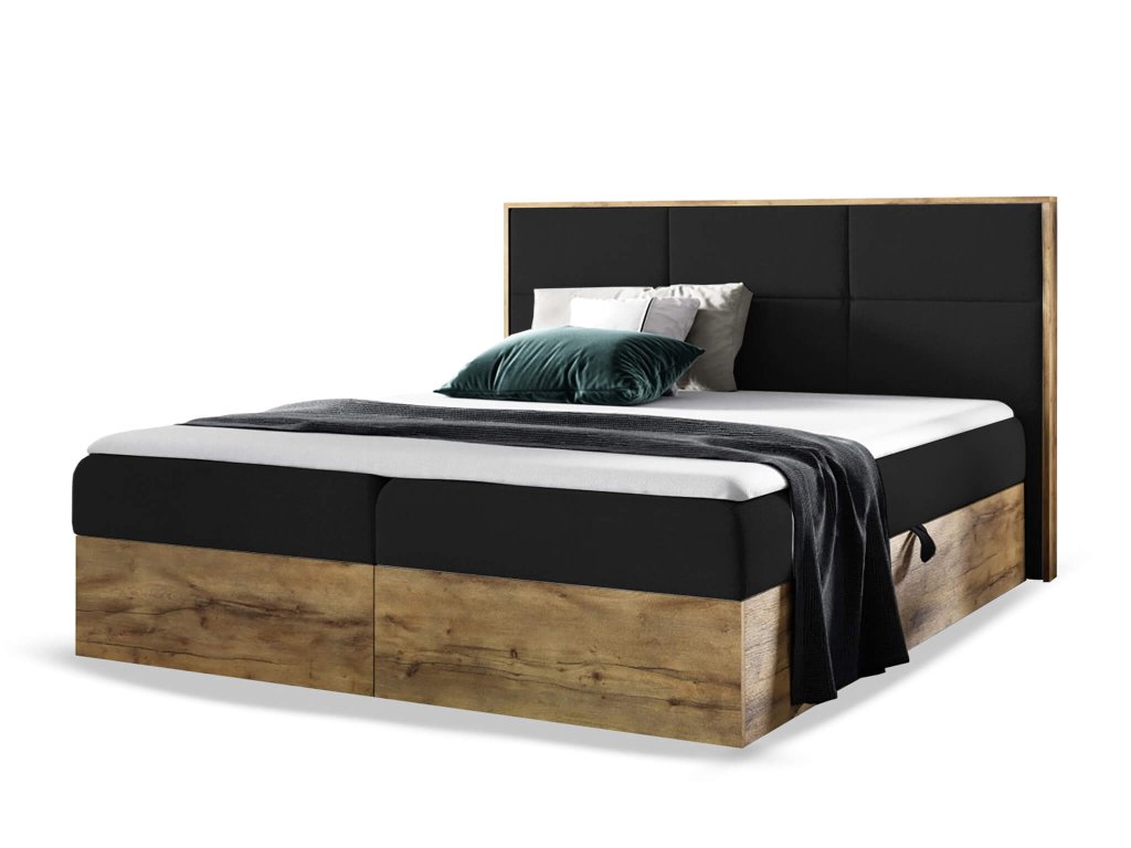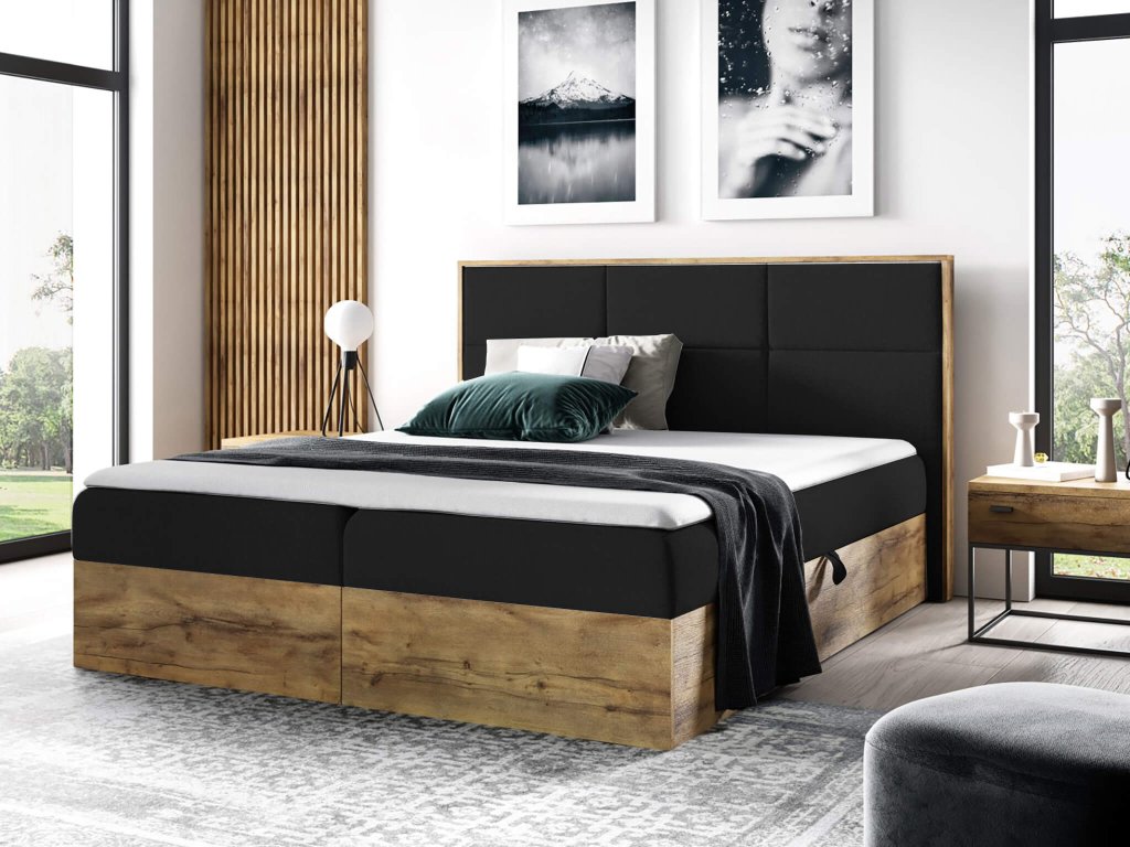 WOOD 2 kárpitozott boxspring ágy ágyneműtartóval és matracokkal - fekete Kronos