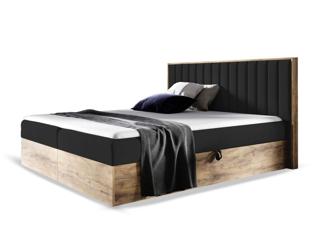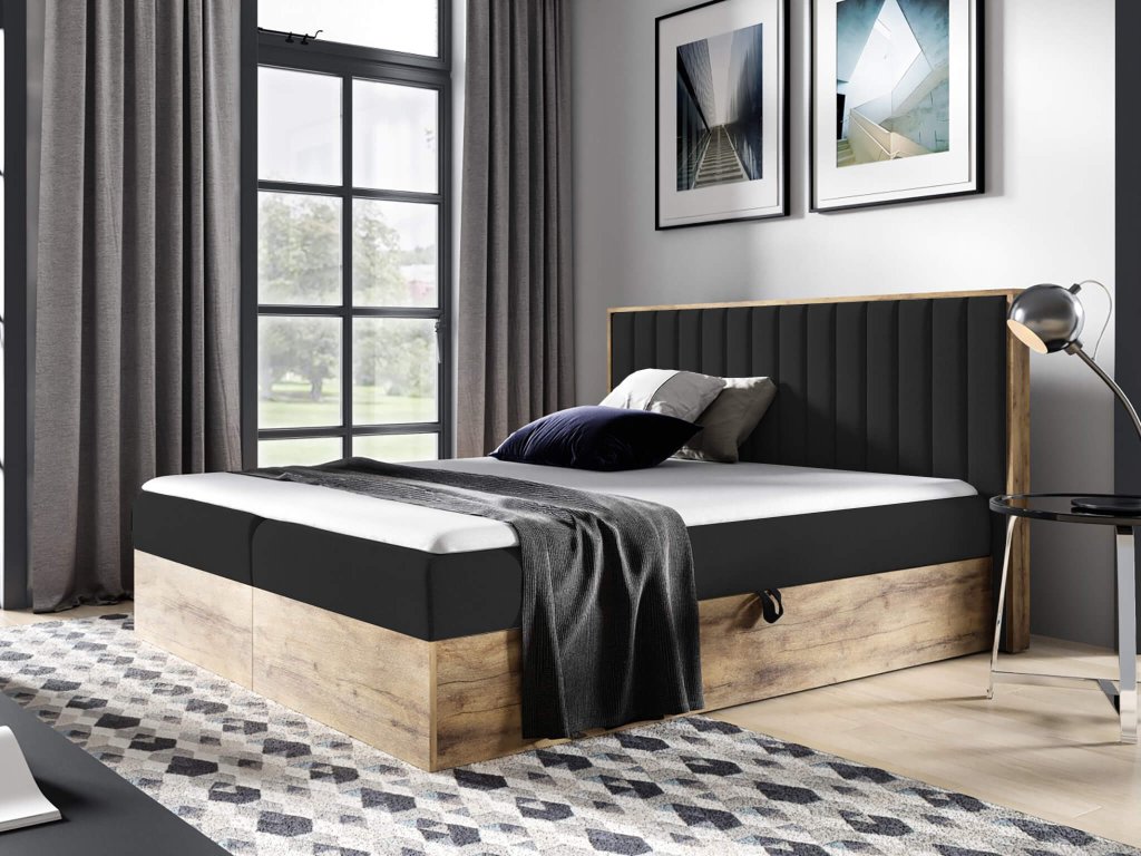 WOOD 4 kárpitozott boxspring franciaágy ágyneműtartóval és matraccal - fekete Kronos