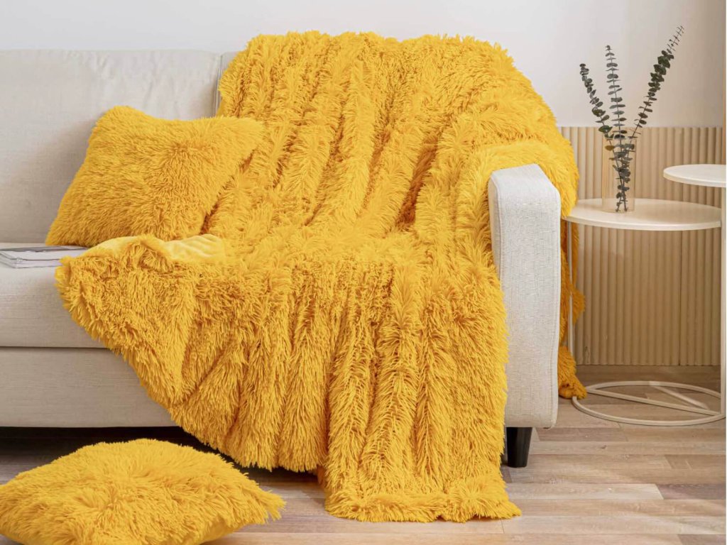 Gyönyörű élénk sárga színű YETI pléd, amely a színének köszönhetően vidámságot visz minden szobába. A pléd két praktikus méretben (220x200 és 200x150 cm) kapható. A takaró nagyon puha és kellemes tapintású. A hosszú szőrű pléd felső része 100 % poliészterből, míg az alsó része 460g/m² grammsúlyú mikroszálból készül. A plédnek nagy hasznát veszi majd a hűvösebb napokon, pokrócként, takaróként vagy ágytakaróként is tudja használni. A hosszú szőrös struktúrájának köszönhetően nagyon jól mutat. Mosógépben mosható maximum 30°C-on. Nem ajánljuk vasalni, fehéríteni vagy vegyileg tisztítani.