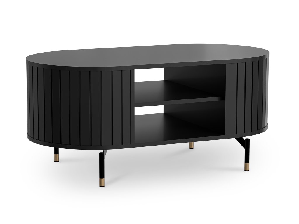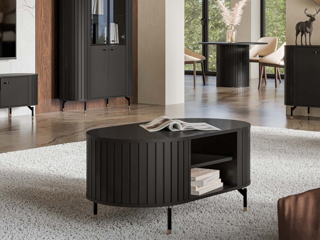 Hozzon létre modern teret a nappalijában a konferenciasztallal Zante luxus fekete színben. Ez a dizájnos konferenciasztal lekerekített élekkel rendelkezik. Minimalista megjelenésének köszönhetően tökéletesen illeszkedik a modern belső térbe. Ha inspirációt keres a hálószobája modern stílusú berendezéséhez, olvassa el cikkünket, amelyben tippeket és ötleteket talál arra, hogyan kombinálhatja a stílusos bútorokat a belső tér többi részével. Két praktikus polcot kínál, amelyek segítenek rendezni az apróságokat, mint például a könyvek, dekorációk vagy más tárgyak, amelyeket kéznél szeretne tartani. A fekete lábak arany elemekkel elegáns dizájnt kölcsönöznek az asztalnak. A felső lap maximális teherbírása 10 kg, ami azt jelenti, hogy biztonságosan elhelyezhet rajta különféle dekorációs tárgyakat vagy lámpákat. A polcok teherbírása 7 kg, ideális kisebb dolgok tárolására.