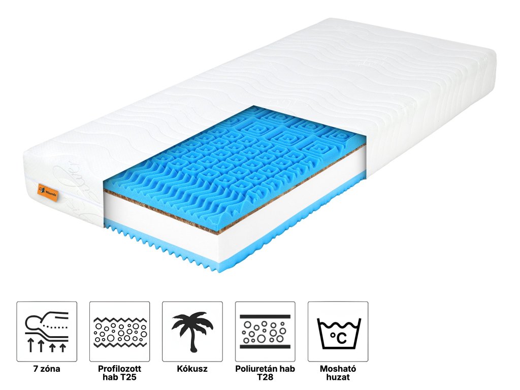 Anyagösszetétel: Poliuretán hab T28, Profilozott poliuretán hab T25, Kókuszréteg, Silver Care huzat