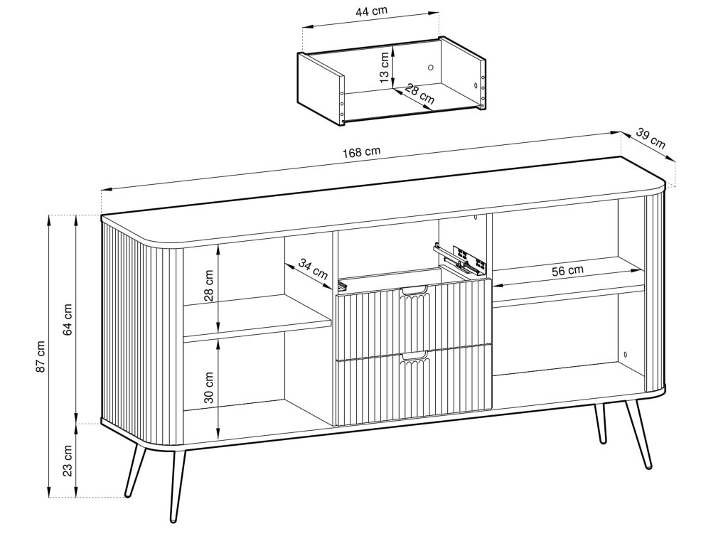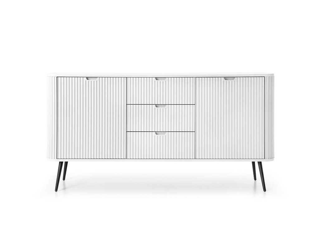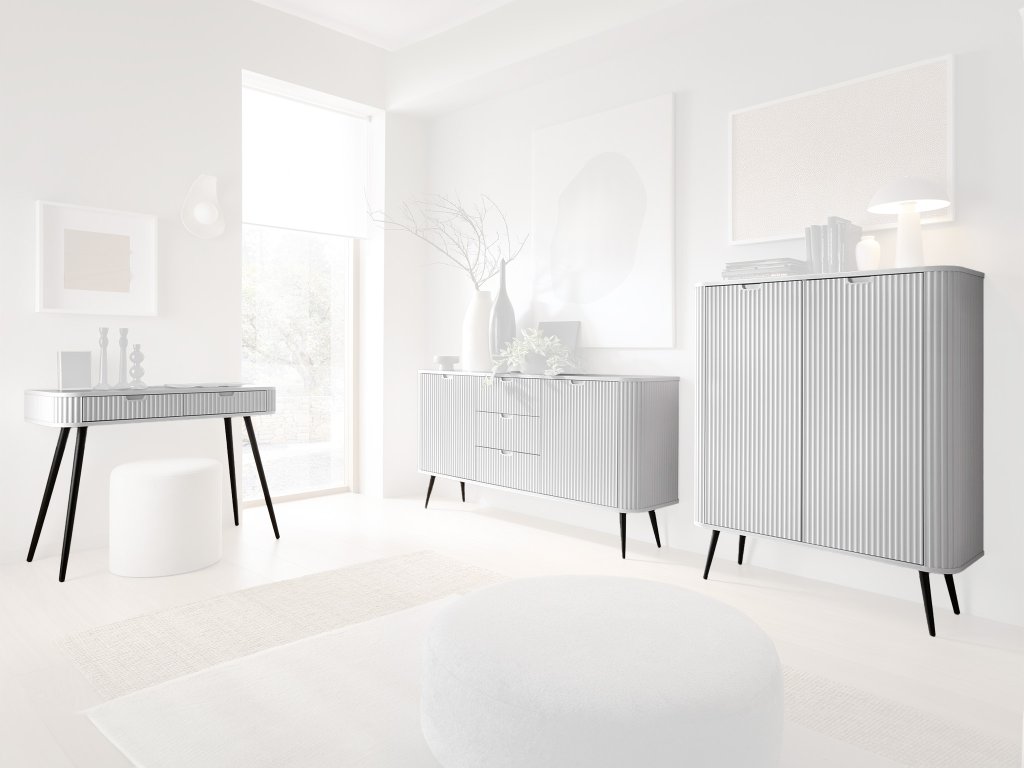 A ZOVA bútorcsaláddal modern és szofisztikált belső teret hozhat létre. Az egész szett 16 mm vastag laminált bútorlapból készült két színváltozatban: elegáns fehér és modern kasmír (bézs) színekben, így világos és letisztult stílusú. A bútor összeállítást fekete magas fém lábak egészítik ki, amelyek nem csak a stabilitását biztosítják, de igazán kontrasztos megjelenést is biztosítanak. Az enyhén lekerekített élek és a bordázott előlapok vizuálisan kellemes hatást keltenek. A klasszikus fogantyúk helyett a bútorlapba vájt mélyedés szolgál az ajtók és fiókok kinyitására. Ez még inkább hozzáad a minimalista designhoz. A ZOVA bútorcsalád tökéletes választás mindazok számára, akik az elegancia és a praktikum kombinációját keresik. Választhatja őket a nappaliba, de az előszobába vagy a hálószobába is.